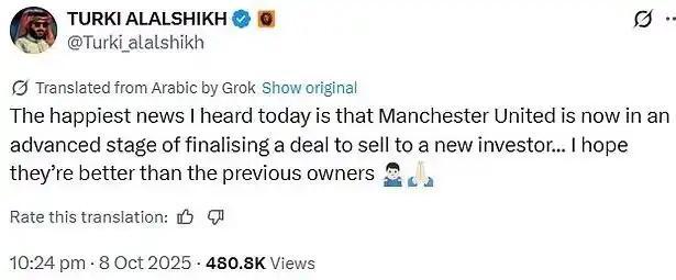 这次传闻的核心人物,是沙特娱乐局局长、亿万富翁图尔基·谢赫。他在社交媒体上罕见发文,暗示自己即将完成对曼联的收购交易,并表示:“我希望新的老板能比之前的更好。”这一句话,引爆了整个欧洲足球圈。《镜报》随即跟进确认——图尔基·谢赫确实是潜在买家之一,且正在评估出价。如果报价达到52亿英镑,将足以说服格雷泽家族点头。